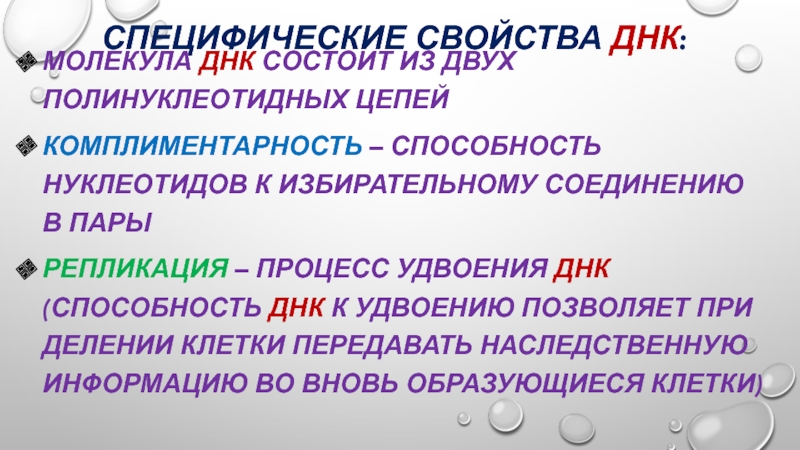 Специфические свойства днк:Молекула днк состоит из двух полинуклеотидных цепейКомплиментарность – способность нуклеотидов к избирательному соединению в парыРепликация