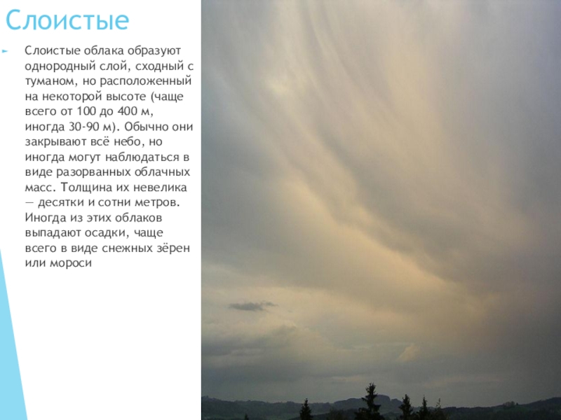 некоторой высоте (чаще всего от 100 до 400 м, иногда 30-90 м). Обычно они закрывают всё небо, но иногда могут наблюдаться в виде разорванных облачных масс. Толщина их невелика — десятки и сотни метров. Иногда из этих облаков выпадают осадки, чаще всего в виде снежных зёрен или мороси
