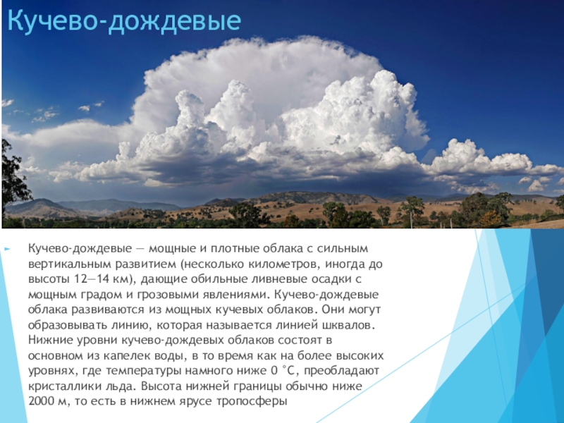 километров, иногда до высоты 12—14 км), дающие обильные ливневые осадки с мощным градом и грозовыми явлениями. Кучево-дождевые облака развиваются из мощных кучевых облаков. Они могут образовывать линию, которая называется линией шквалов. Нижние уровни кучево-дождевых облаков состоят в основном из капелек воды, в то время как на более высоких уровнях, где температуры намного ниже 0 °C, преобладают кристаллики льда. Высота нижней границы обычно ниже 2000 м, то есть в нижнем ярусе тропосферы