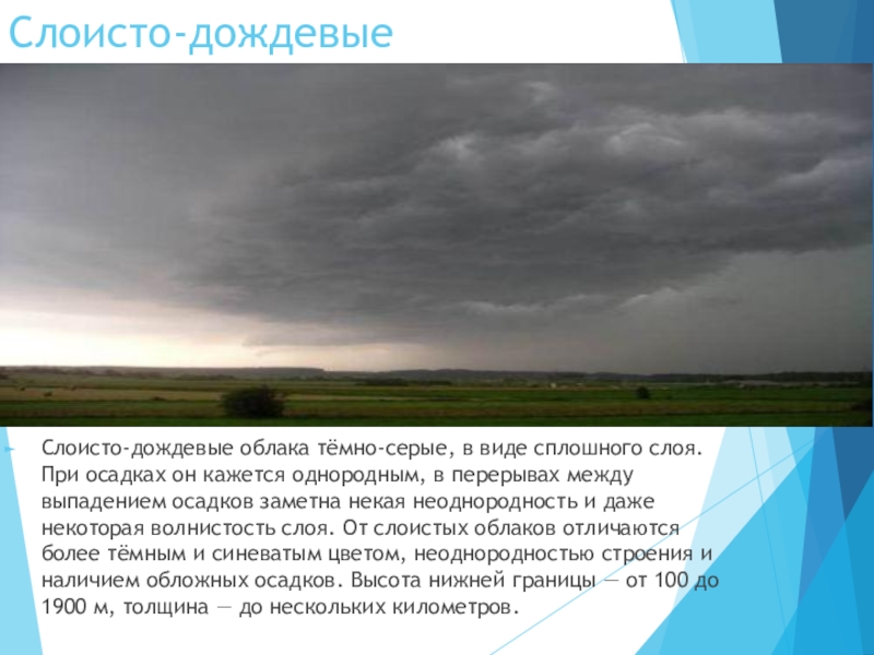 однородным, в перерывах между выпадением осадков заметна некая неоднородность и даже некоторая волнистость слоя. От слоистых облаков отличаются более тёмным и синеватым цветом, неоднородностью строения и наличием обложных осадков. Высота нижней границы — от 100 до 1900 м, толщина — до нескольких километров.