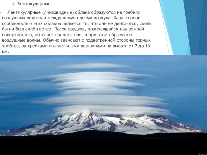 на гребнях воздушных волн или между двумя слоями воздуха. Характерной особенностью этих облаков является то, что они не двигаются, сколь бы ни был силён ветер. Поток воздуха, проносящийся над земной поверхностью, обтекает препятствия, и при этом образуются воздушные волны. Обычно зависают с подветренной стороны горных хребтов, за хребтами и отдельными вершинами на высоте от 2 до 15 км.