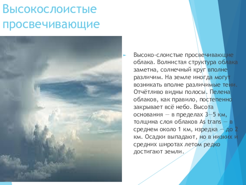 различим. На земле иногда могут возникать вполне различимые тени. Отчётливо видны полосы. Пелена облаков, как правило, постепенно закрывает всё небо. Высота основания — в пределах 3—5 км, толщина слоя облаков As trans — в среднем около 1 км, изредка — до 2 км. Осадки выпадают, но в низких и средних широтах летом редко достигают земли.
