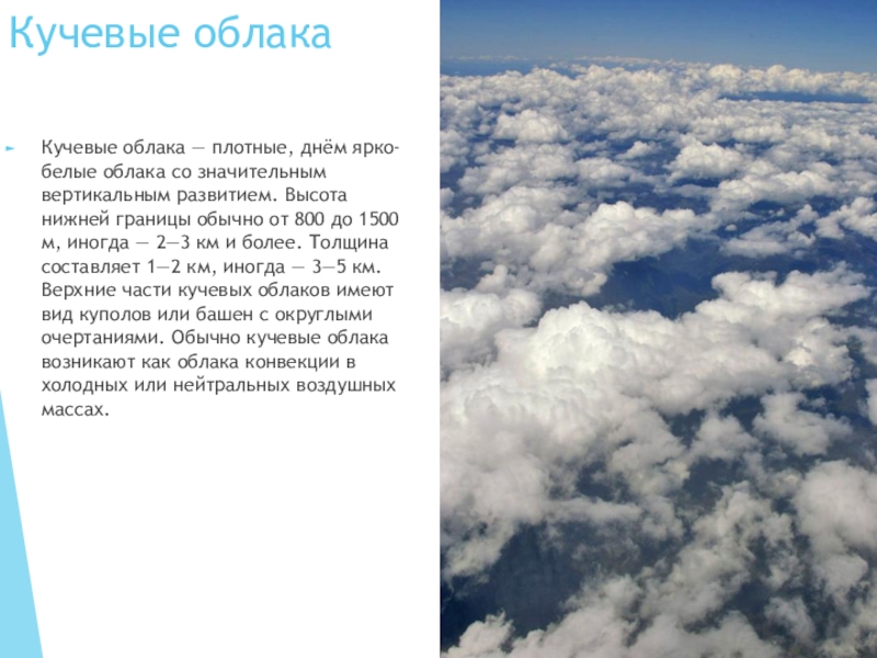 вертикальным развитием. Высота нижней границы обычно от 800 до 1500 м, иногда — 2—3 км и более. Толщина составляет 1—2 км, иногда — 3—5 км. Верхние части кучевых облаков имеют вид куполов или башен с округлыми очертаниями. Обычно кучевые облака возникают как облака конвекции в холодных или нейтральных воздушных массах.