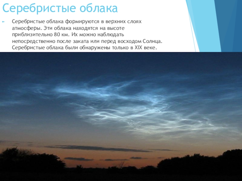 на высоте приблизительно 80 км. Их можно наблюдать непосредственно после заката или перед восходом Солнца. Серебристые облака были обнаружены только в XIX веке.