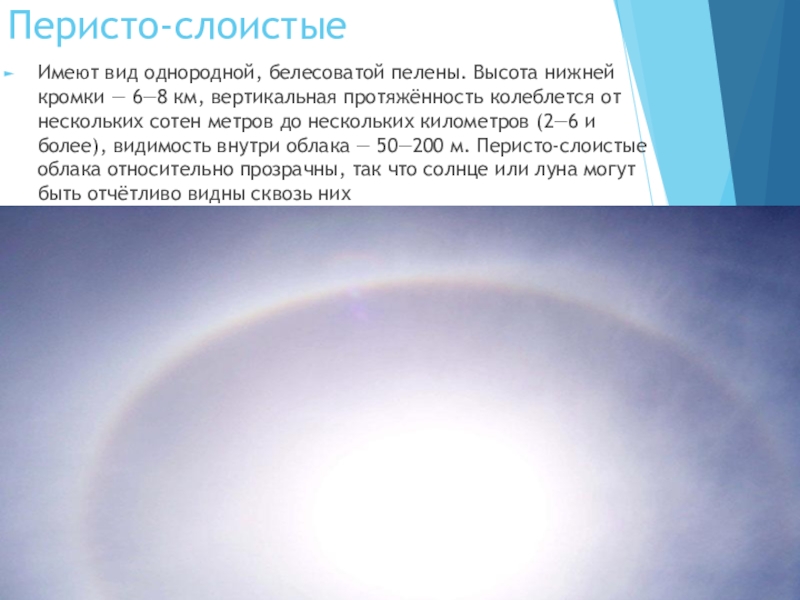 вертикальная протяжённость колеблется от нескольких сотен метров до нескольких километров (2—6 и более), видимость внутри облака — 50—200 м. Перисто-слоистые облака относительно прозрачны, так что солнце или луна могут быть отчётливо видны сквозь них