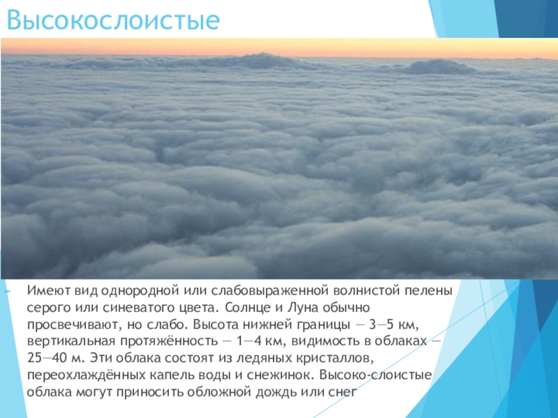цвета. Солнце и Луна обычно просвечивают, но слабо. Высота нижней границы — 3—5 км, вертикальная протяжённость — 1—4 км, видимость в облаках — 25—40 м. Эти облака состоят из ледяных кристаллов, переохлаждённых капель воды и снежинок. Высоко-слоистые облака могут приносить обложной дождь или снег