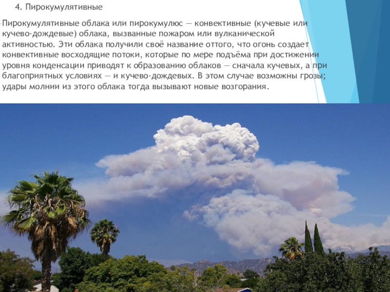 или кучево-дождевые) облака, вызванные пожаром или вулканической активностью. Эти облака получили своё название оттого, что огонь создает конвективные восходящие потоки, которые по мере подъёма при достижении уровня конденсации приводят к образованию облаков — сначала кучевых, а при благоприятных условиях — и кучево-дождевых. В этом случае возможны грозы; удары молнии из этого облака тогда вызывают новые возгорания.