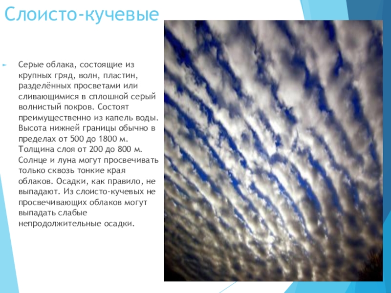 или сливающимися в сплошной серый волнистый покров. Состоят преимущественно из капель воды. Высота нижней границы обычно в пределах от 500 до 1800 м. Толщина слоя от 200 до 800 м. Солнце и луна могут просвечивать только сквозь тонкие края облаков. Осадки, как правило, не выпадают. Из слоисто-кучевых не просвечивающих облаков могут выпадать слабые непродолжительные осадки.