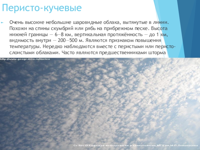 Очень высокие небольшие шаровидные облака, вытянутые в линии. Похожи на спины