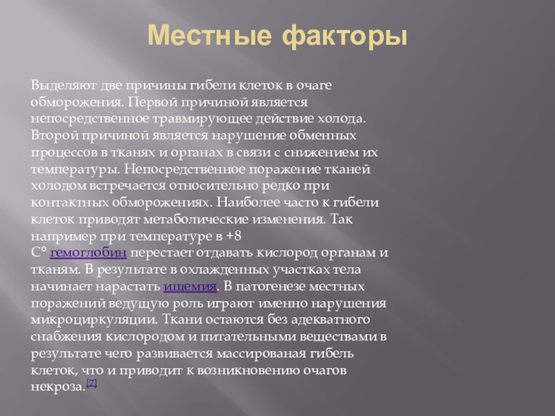 является непосредственное травмирующее действие холода. Второй причиной является нарушение обменных процессов в тканях и органах в связи с снижением их температуры. Непосредственное поражение тканей холодом встречается относительно редко при контактных обморожениях. Наиболее часто к гибели клеток приводят метаболические изменения. Так например при температуре в +8 С° гемоглобин перестает отдавать кислород органам и тканям. В результате в охлажденных участках тела начинает нарастать ишемия. В патогенезе местных поражений ведущую роль играют именно нарушения микроциркуляции. Ткани остаются без адекватного снабжения кислородом и питательными веществами в результате чего развивается массированая гибель клеток, что и приводит к возникновению очагов некроза.[7]