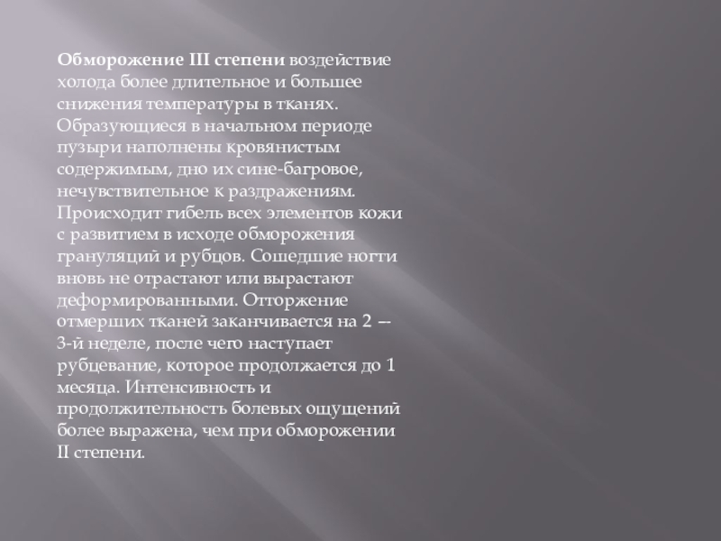 тканях. Образующиеся в начальном периоде пузыри наполнены кровянистым содержимым, дно их сине-багровое, нечувствительное к раздражениям. Происходит гибель всех элементов кожи с развитием в исходе обморожения грануляций и рубцов. Сошедшие ногти вновь не отрастают или вырастают деформированными. Отторжение отмерших тканей заканчивается на 2 — 3-й неделе, после чего наступает рубцевание, которое продолжается до 1 месяца. Интенсивность и продолжительность болевых ощущений более выражена, чем при обморожении II степени.