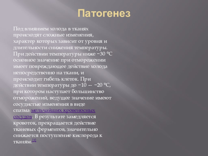 от уровня и длительности снижения температуры. При действии температуры ниже −30 °C основное значение при отморожении имеет повреждающее действие холода непосредственно на ткани, и происходит гибель клеток. При действии температуры до −10 — −20 °C, при котором наступает большинство отморожений, ведущее значение имеют сосудистые изменения в виде спазма мельчайших кровеносных сосудов. В результате замедляется кровоток, прекращается действие тканевых ферментов, значительно снижается поступление кислорода к тканям.[3]