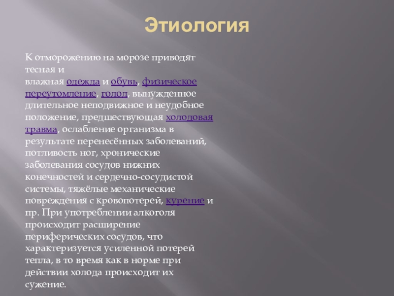 неподвижное и неудобное положение, предшествующая холодовая травма, ослабление организма в результате перенесённых заболеваний, потливость ног, хронические заболевания сосудов нижних конечностей и сердечно-сосудистой системы, тяжёлые механические повреждения с кровопотерей, курение и пр. При употреблении алкоголя происходит расширение периферических сосудов, что характеризуется усиленной потерей тепла, в то время как в норме при действии холода происходит их сужение.