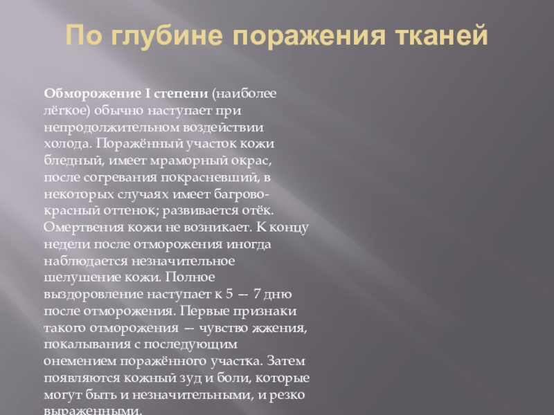 Обморожение I степени (наиболее лёгкое) обычно наступает при непродолжительном