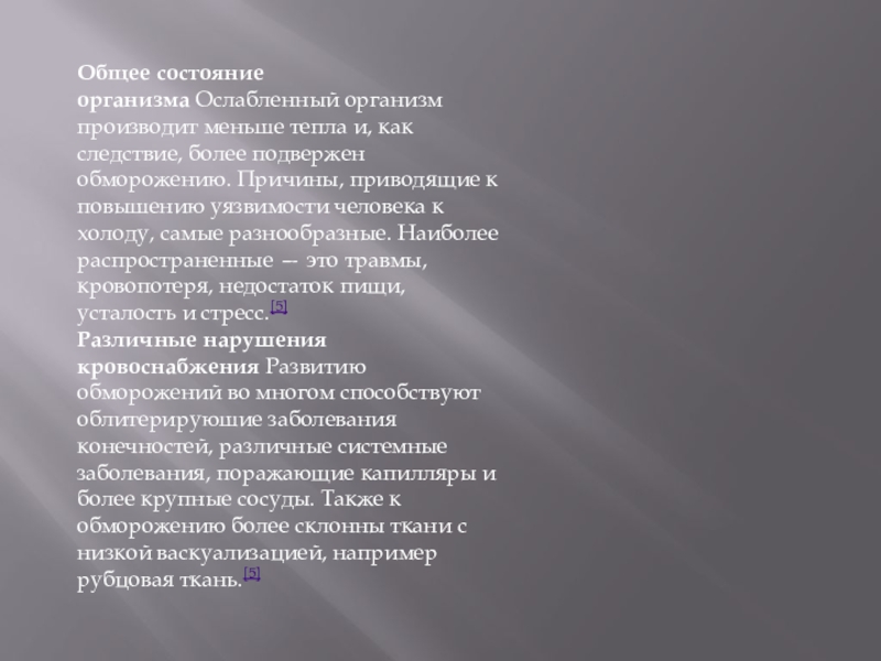 подвержен обморожению. Причины, приводящие к повышению уязвимости человека к холоду, самые разнообразные. Наиболее распространенные — это травмы, кровопотеря, недостаток пищи, усталость и стресс.[5]