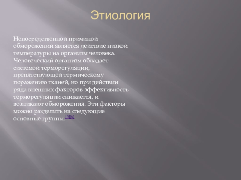Слайд 2Обмороже́ние (лат. congelatio), или отмороже́ние (термин, применяемый в медицине) — повреждение тканей организма под воздействием низких температур. Нередко