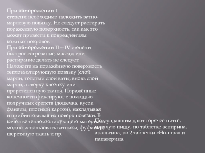 Пострадавшим дают горячее питьё, горячую пищу, по таблетке аспирина, анальгина, по 2 таблетки «Но-шпа» и папаверина.