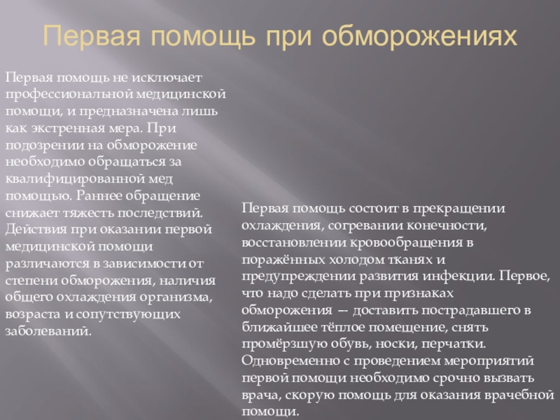 Действия при оказании первой медицинской помощи различаются в зависимости от степени обморожения, наличия общего охлаждения организма, возраста и сопутствующих заболеваний.