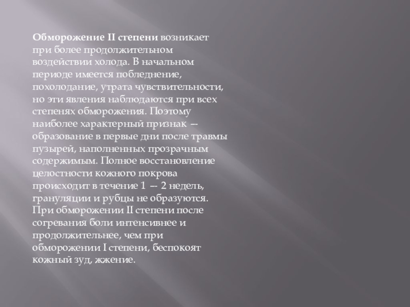 Слайд 14Обморожение II степени возникает при более продолжительном воздействии холода. В начальном периоде