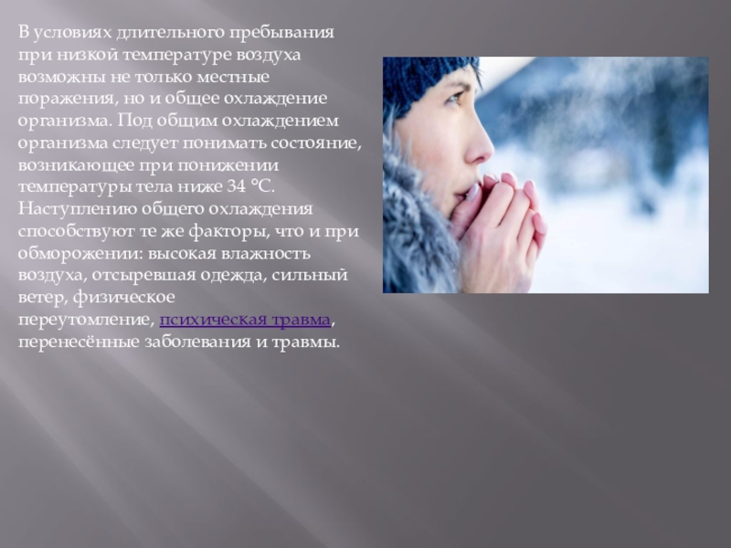 Слайд 17В условиях длительного пребывания при низкой температуре воздуха возможны не только