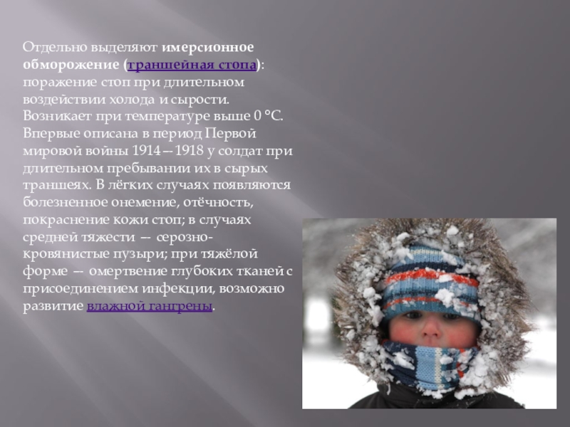Слайд 10Отдельно выделяют имерсионное обморожение (траншейная стопа):поражение стоп при длительном воздействии холода и
