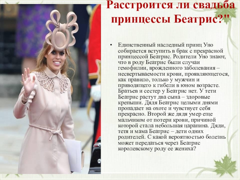 F: ХНХН(тетя), ХНУ (дядя – здоров), ХНХh (мама – носитель заболевания), ХhУ (дядя, умерший в раннем детстве). Если Беатрис получила по линии мамы ген – ХН, то королевском роду жениха болезнь не может передаться. Если Беатрис получила по линии мамы ген Хh – несущий гемофилию, тогда: