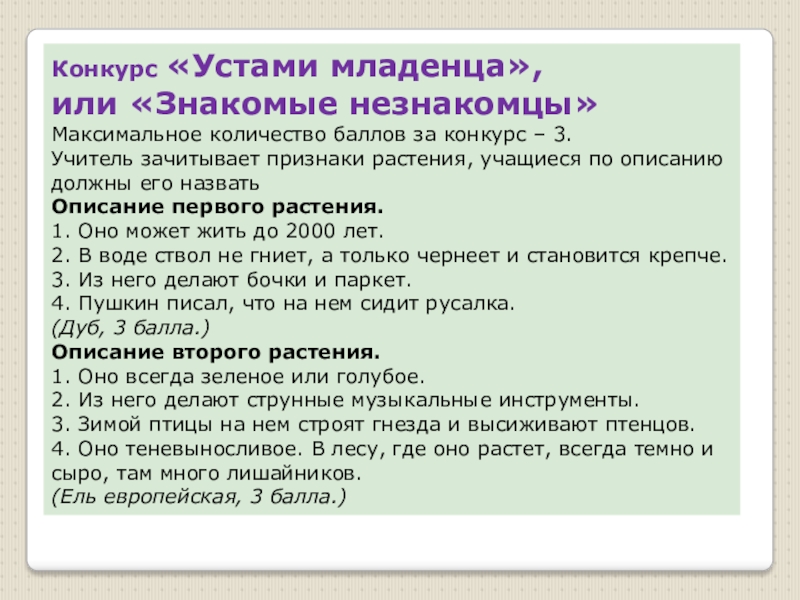 Учитель зачитывает признаки растения, учащиеся по описанию должны его назвать