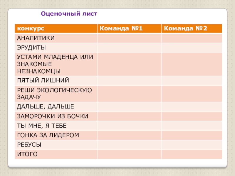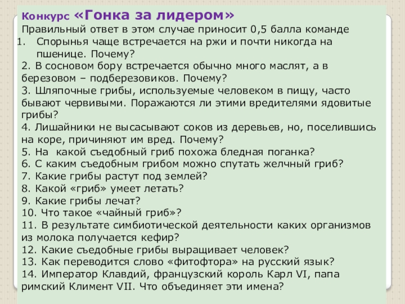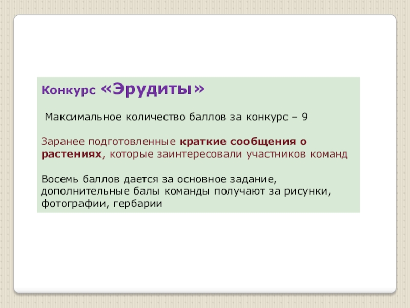 Восемь баллов дается за основное задание, дополнительные балы команды получают за рисунки, фотографии, гербарии