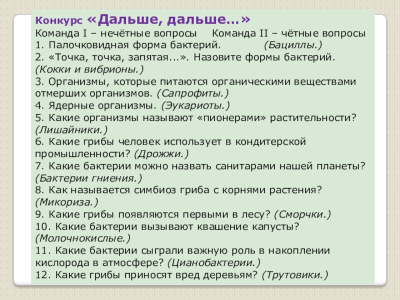 •Две команды (по названиям систематических групп) готовят выступления, вопросы, ответы,