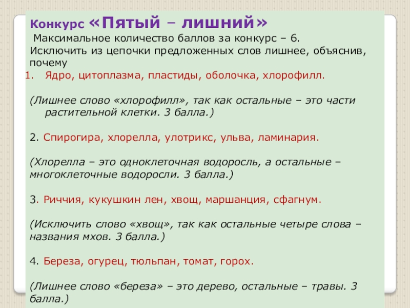 (Лишнее слово «хлорофилл», так как остальные – это части растительной клетки. 3 балла.)