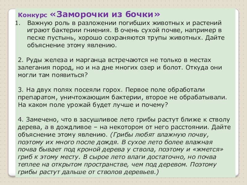 играют бактерии гниения. В очень сухой почве, например в песке пустынь, хорошо сохраняются трупы животных. Дайте объяснение этому явлению.
