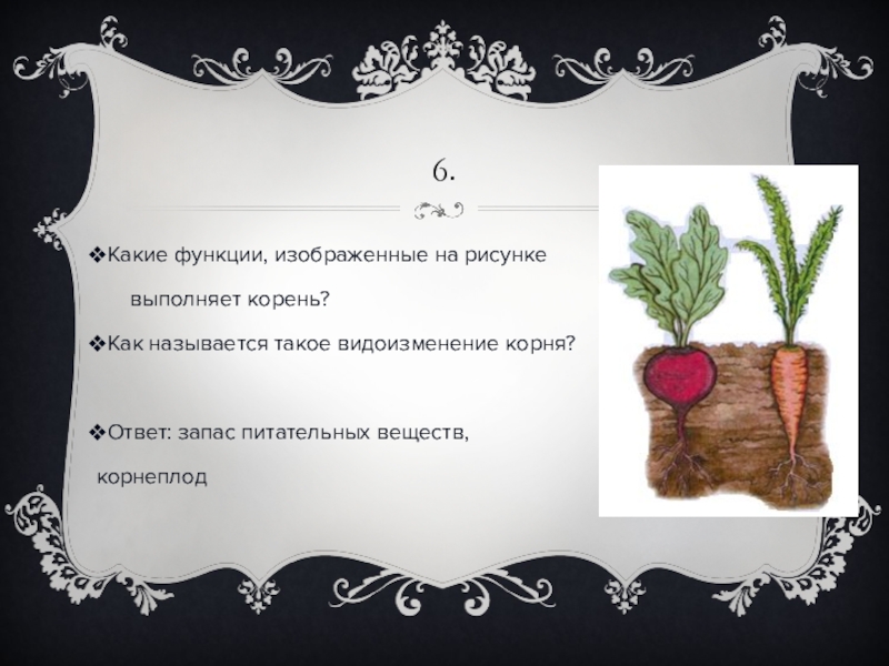 6.Какие функции, изображенные на рисунке   выполняет корень?Как называется такое видоизменение корня?Ответ: запас питательных веществ, корнеплод