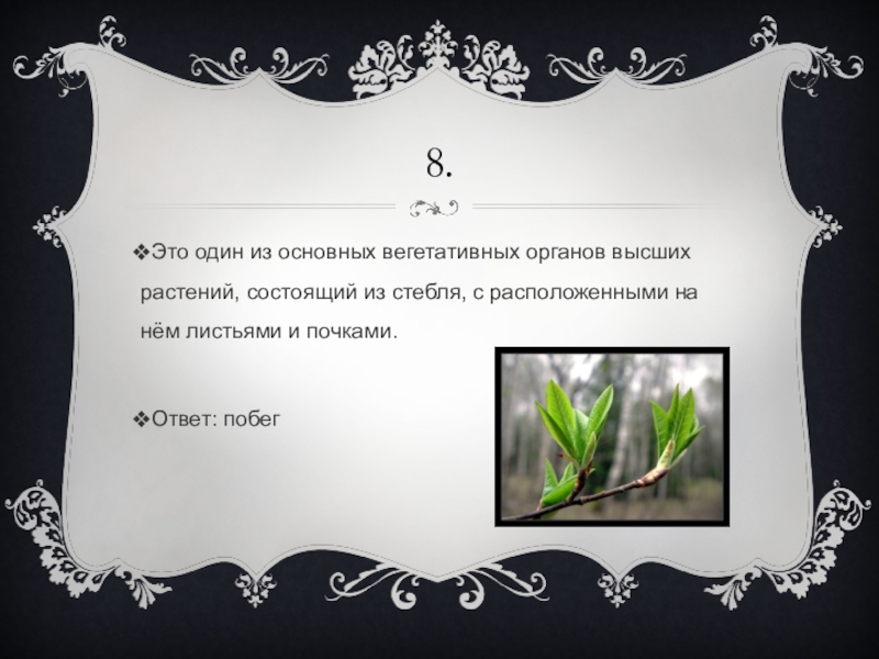 8.Это один из основных вегетативных органов высших растений, состоящий из стебля, с расположенными на нём листьями и