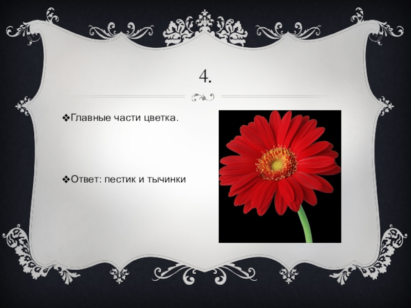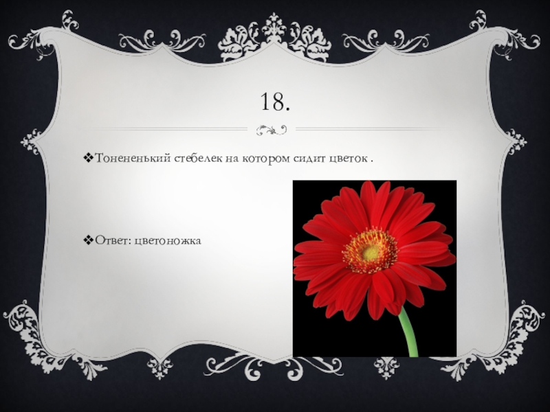 18.Тонененький стебелек на котором сидит цветок .Ответ: цветоножка