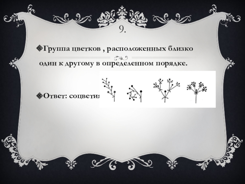 9. Группа цветков , расположенных близко один к другому в определенном порядке.Ответ: соцветия