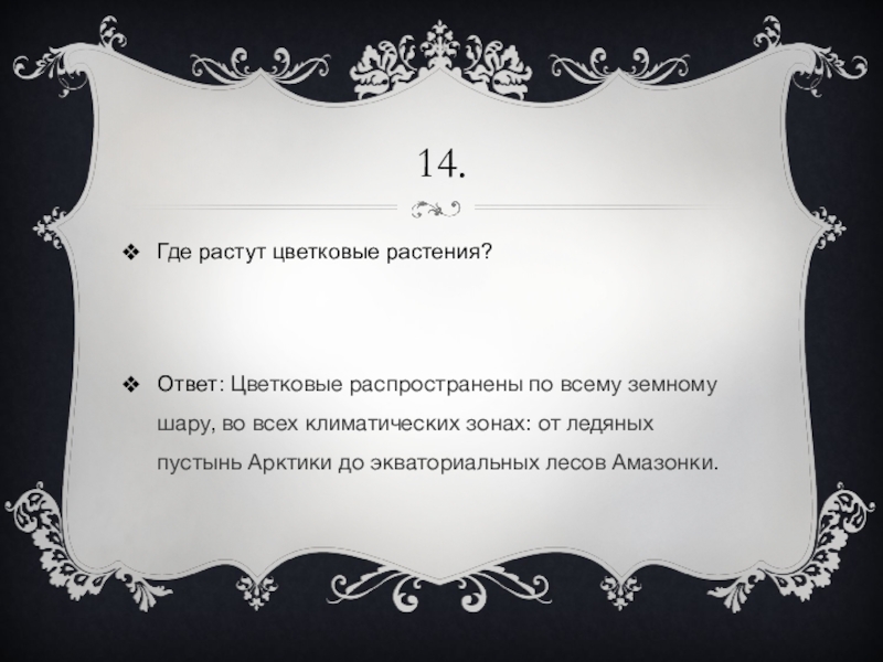 14.Где растут цветковые растения?Ответ: Цветковые распространены по всему земному шару, во всех климатических зонах: от ледяных пустынь
