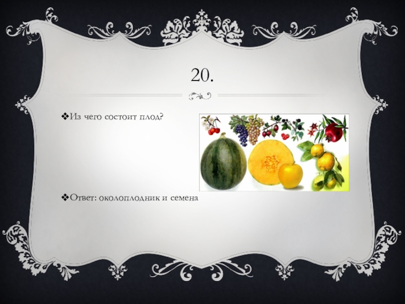 20.Из чего состоит плод?Ответ: околоплодник и семена