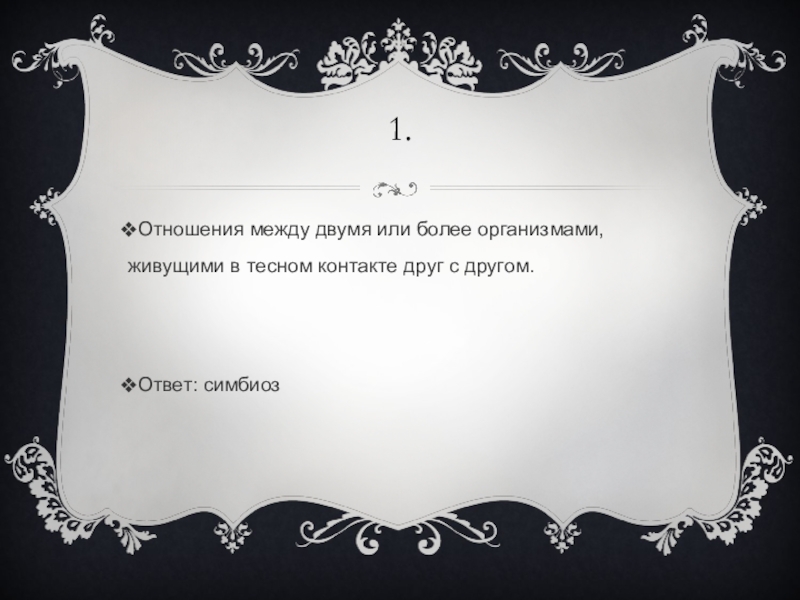 1.Отношения между двумя или более организмами, живущими в тесном контакте друг с другом. Ответ: симбиоз
