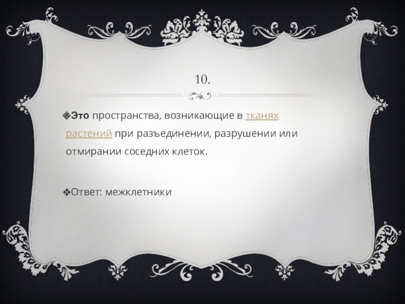 10.Это пространства, возникающие в тканях растений при разъединении, разрушении или отмирании соседних клеток.Ответ: межклетники