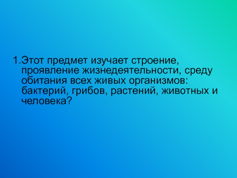 1.Этот предмет изучает строение, проявление жизнедеятельности, среду обитания всех живых организмов: бактерий, грибов, растений, животных и человека?