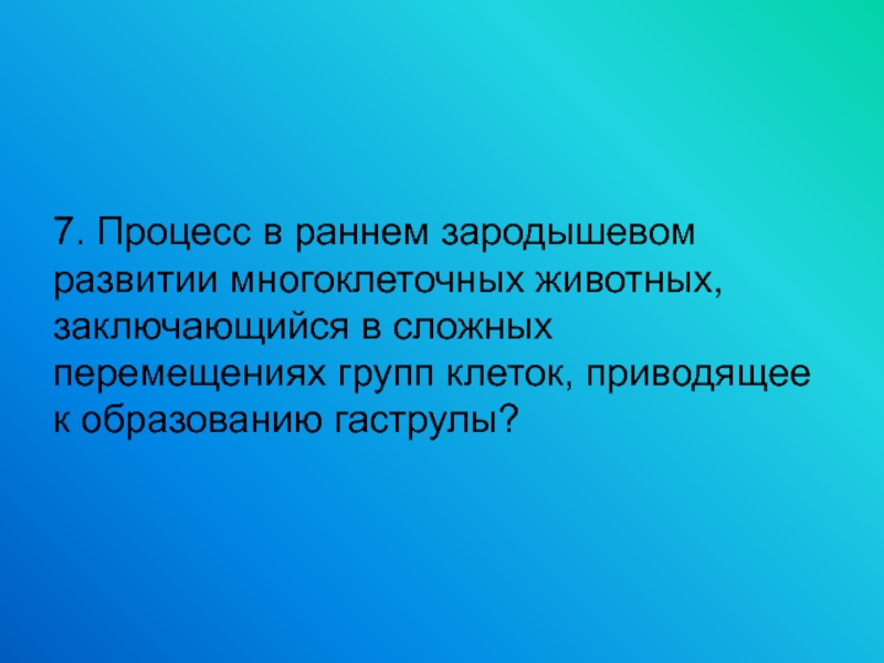 7. Процесс в раннем зародышевом развитии многоклеточных животных, заключающийся в сложных перемещениях групп клеток, приводящее к образованию