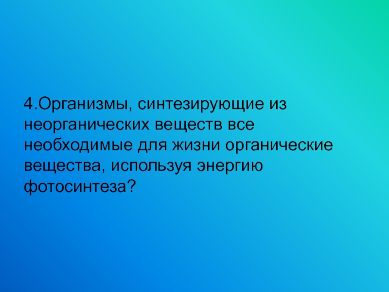 4.Организмы, синтезирующие из неорганических веществ все необходимые для жизни органические вещества, используя энергию фотосинтеза?