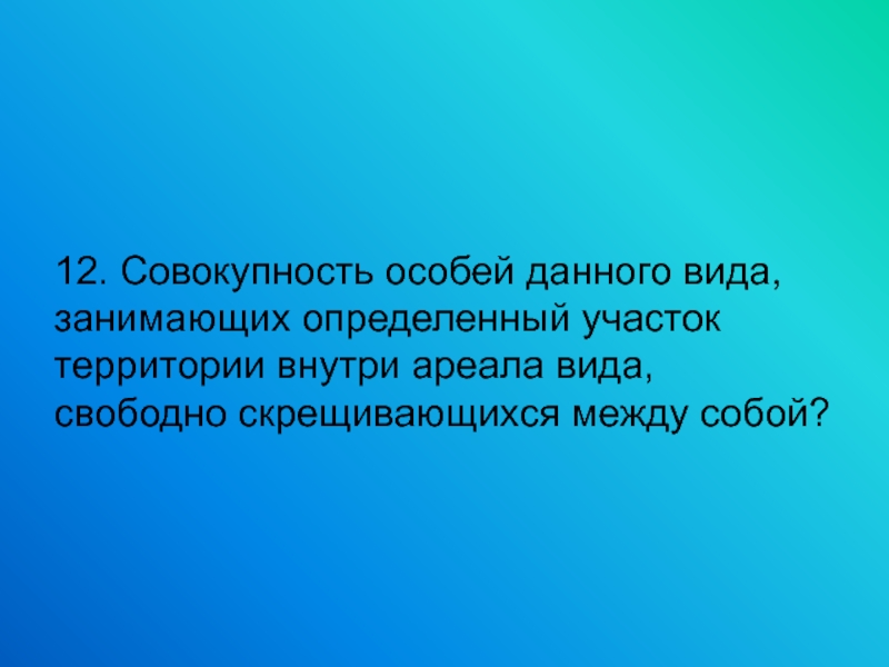 12. Совокупность особей данного вида, занимающих определенный участок территории внутри ареала вида, свободно скрещивающихся между собой?