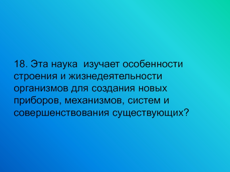 18. Эта наука изучает особенности строения и жизнедеятельности организмов для создания новых приборов, механизмов, систем и совершенствования