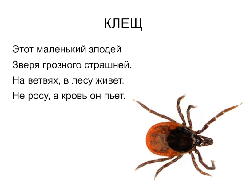 КЛЕЩЭтот маленький злодей Зверя грозного страшней. На ветвях, в лесу живет. Не росу, а кровь он пьет.