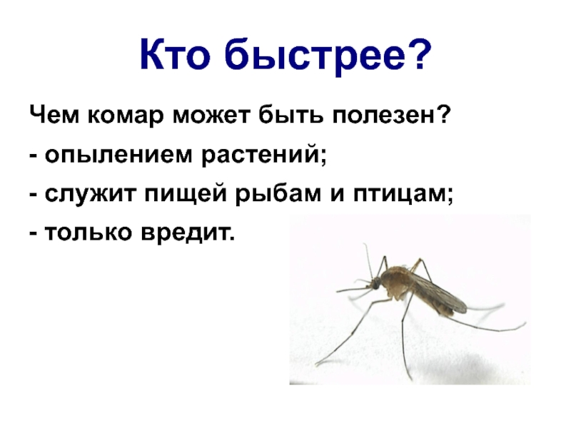 Кто быстрее?Чем комар может быть полезен?- опылением растений;- служит пищей рыбам и птицам;- только вредит.