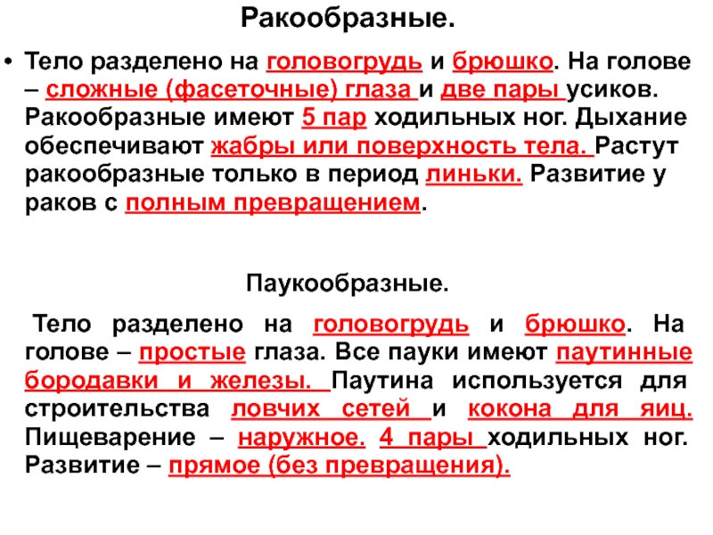 глаза и две пары усиков. Ракообразные имеют 5 пар ходильных ног. Дыхание обеспечивают жабры или поверхность тела. Растут ракообразные только в период линьки. Развитие у раков с полным превращением.