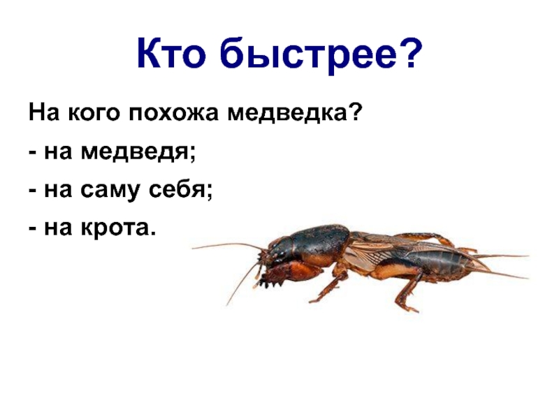 Кто быстрее?На кого похожа медведка?- на медведя;- на саму себя;- на крота.