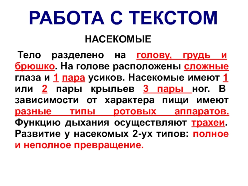 РАБОТА С ТЕКСТОМНАСЕКОМЫЕ	Тело разделено на голову, грудь и брюшко. На голове расположены сложные глаза и 1 пара