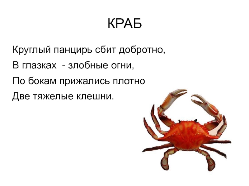 КРАБКруглый панцирь сбит добротно,В глазках  - злобные огни,По бокам прижались плотноДве тяжелые клешни.